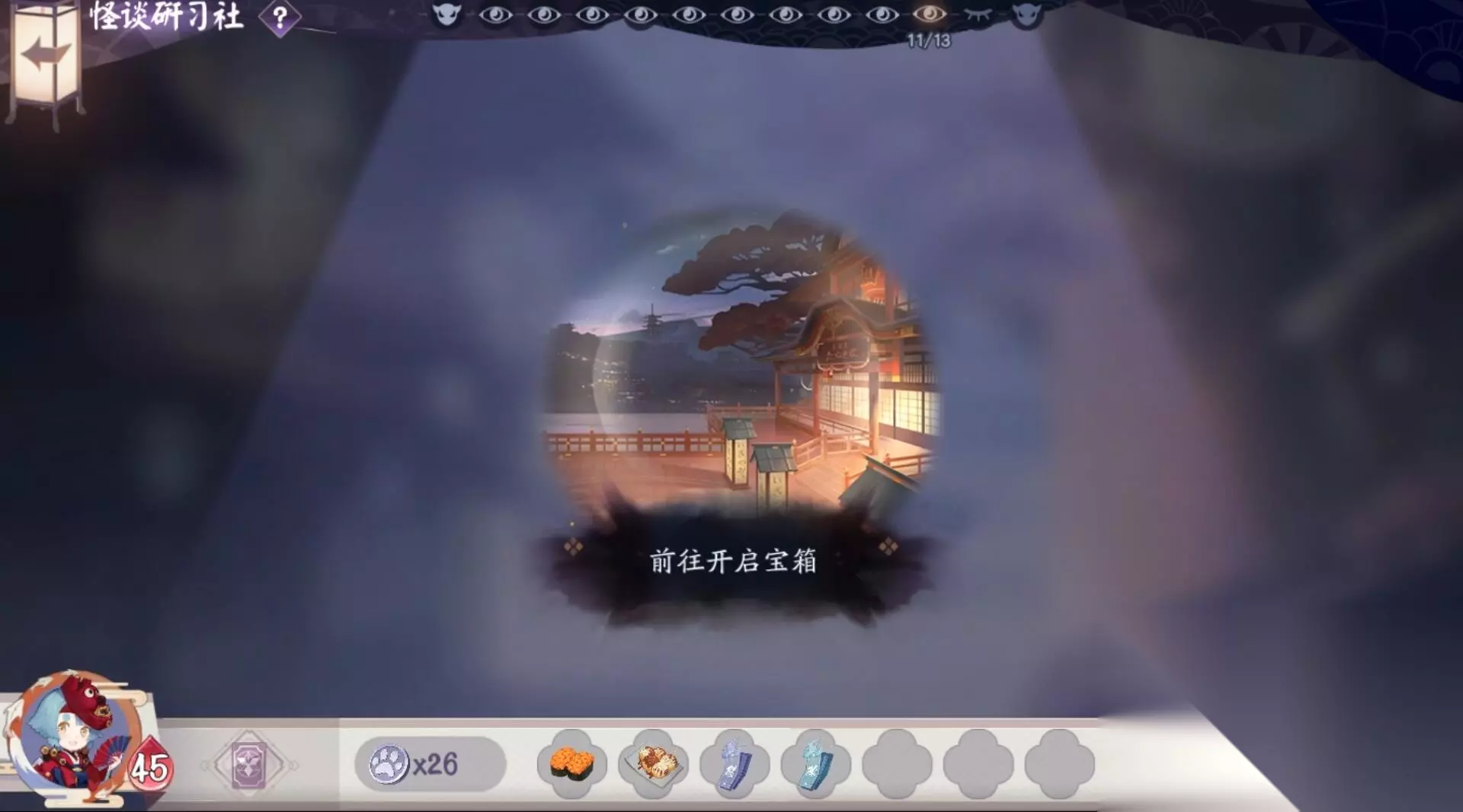 第十一关:宝箱/狸猫酒馆/青蛙瓷器的隐藏房间 开启宝箱可以获得卡牌和道具的奖励。 第十二关:对阵镰鼬三太郎 敌方生命值:30 敌方式神:大天狗 雪女 雪童子 妖琴师 敌方技能:冰雪漫天 技能效果:每个回合,眩晕一个雪女和雪童子以外的式神。