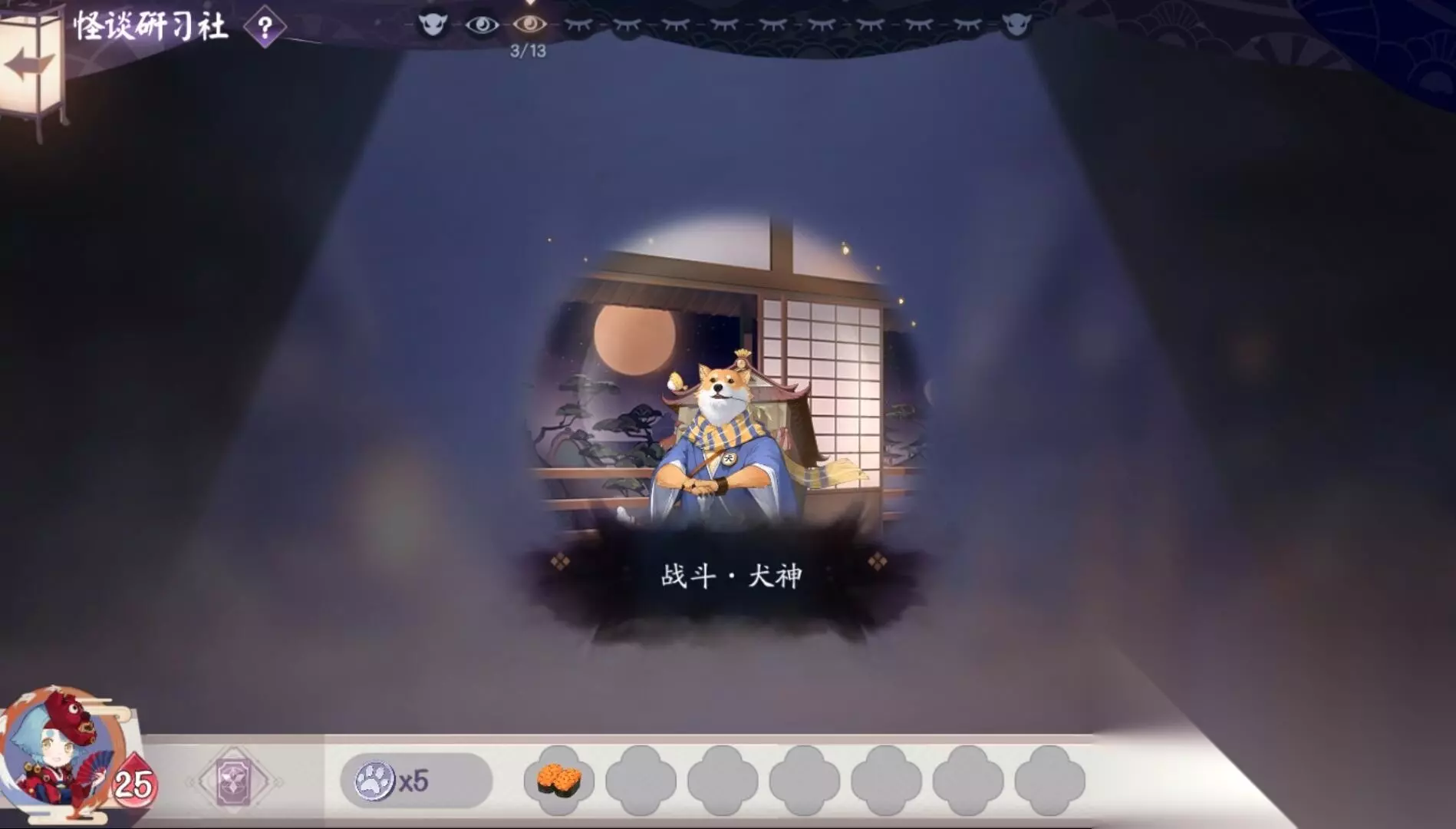 第三关:对战犬神(固定) 敌方生命值:20 敌方式神:犬神 桃花妖 有些关卡的对战妖怪是固定的,一旦熟悉对战思路以后,对局就会变得轻松许多。