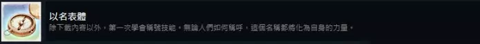 注意点4:准备好钱以及提前存档 军武狂材料是一方面,花钱也是一方面,DLC送的钱总算是派上了用场,可以提前保存好存档,然后领取DLC的钱,做100种武器我大概是准备了接近50W,建议先去把支线做完,任务会奖励很多钱,解锁完成就之后再回档。 技能成就 23. 以名表体 除下载内容以外,第一次学会称号技能。