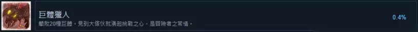 36. 巨体猎人 击败20种巨体。(简单来说就是精英怪,开局那个43级的巨型螳螂就是其一,笔者跟随主线和支线做的,目前应该只缺两个)