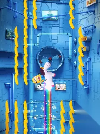 不过下图中的画面又让人感到惊喜:黄色小胶囊骑在一只独角兽上面,在满是香蕉的实验室里向上飞翔。或者Gameloft也清楚单纯的跑酷游戏已经很难再吸引玩家的关注了,相信我们应该在《卑鄙的我:胶囊快跑》中可以发现一些更为新鲜的玩法,虽然它还是一个跑酷。
