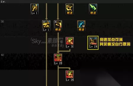 男漫游的输出基本不和转职前的小技能挂钩,但由于花式的全技能柔化设定,把每个小技能点1,可在程度上增加这个职业的趣味。 在85级版本地位较高的[银弹],随着男漫游技能伤害的不断加强,如今的占比已经非常低了,如果有习惯使用的玩家可以点满,但个人还是建议直接点1,在银弹上消耗的SP,足够用来补一下其他输出效率高的技能。 [致命射击(爆头一击)]是男漫游的主力续航技能,一般情况下是建议加满的。但这个技能在竞速、或者需要追求一套技能的玩法下,使用频率并不高。我自己的竞速加点是优先点满了除突袭以外的所有无色,剩下的SP再来补爆头一击。所以各位可以根据自己的玩法需求来点这个技能,是能根据所刷副本对输出的要求,来做出灵活的调整。 [男漫游 25-45级技能加点]