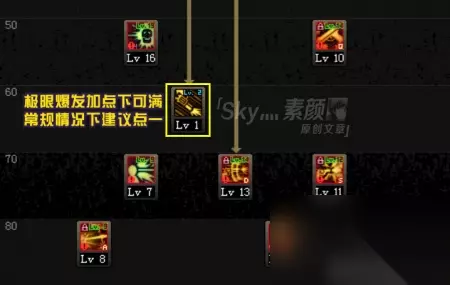 此区间内的取舍较多,想必大多数玩家最纠结的就是走射和多爆。就这两个技能而言,[多爆]的爆发形态更好、CD更短,走射在这两个方面则要相对差一些。但[走射]也有它的优点,一方面是清小怪速度快,另一方面是施放灵活,并且能用于调整角色位移,所以个人并没有舍弃走射。 并且在竞速的玩法下,走射清完小怪后可直接运用自带的移速来过图,使用起来是非常方便的,所以个人在竞速加点下点满了走射。在其他玩法下(Raid)也没有舍弃走射。但如果你追求一套,那么走射的倾泻速度确实不如突袭,可以考虑舍弃走射去点满突袭。 [男漫游 50-85级技能加点]