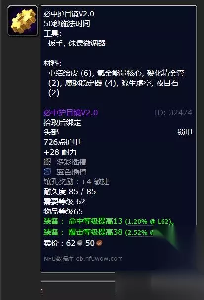 《魔兽世界》怀旧服WLK必中护目镜V2.0制作材料 工程等级:工程350级 职业限制:猎人、萨满祭司