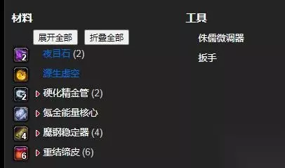 制作材料:重结缔皮 (6)、氪金能量核心、硬化精金管 (2)、魔钢稳定器 (4)、源生虚空、夜目石 (2)