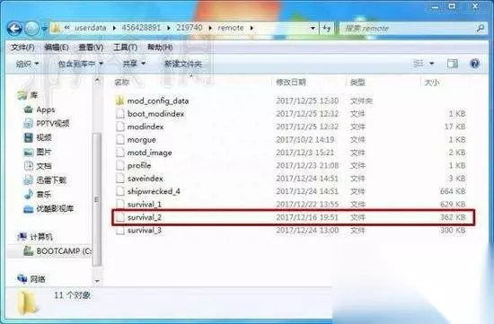 2. 解压完后得到survival_2,你通过上面的方法找到存档位置,然后把这个文件放到那里面去,进入游戏就可以玩了。红框内就是我加进去的存档。然后进入游戏就可以玩了。
