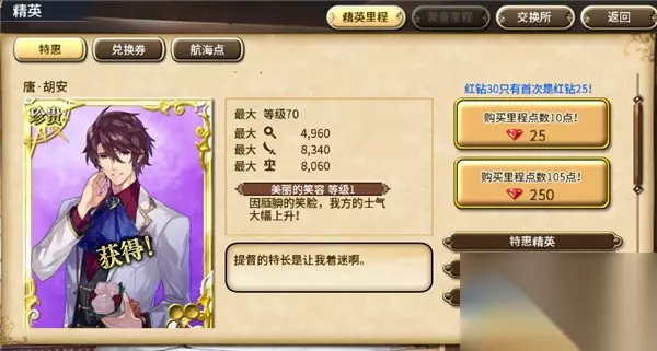 【与著名航海家并肩冒险】 说到《大航海时代5》,就不能不提游戏中的特色(坑钱)系统:精英招募。利用这个功能,玩家们能够招募到历史上有名的大航海家,比如唐•胡安、彼得一世、斐迪南•麦哲伦等等著名人物与你一同冒险。 但是大家应该还没有忘记《大航海时代5》是一款页游、手游的双端游戏,普通的精英招募方法获取这些著名航海家的几率简直低得可怕……真的想要获取的话,小编没有什么好方法,只能【充值】了。