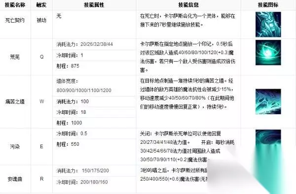 英雄属性 生命值465+75 法力值331+61 攻击力45.45+3.25 攻击速度0.64+2% 护甲14.5+3.5 移动速度335 攻击距离450 使用技巧 当你使用 让友军帮忙,告诉你何时使用安魂曲,从而击杀在不同线的对手。 用荒芜来打钱及骚扰敌方英雄是非常有效的。 对手使用 卡尔萨斯死后能够施放短暂的技能。远离他的尸体以保安全。 确保你有足够的生命值从安魂曲中存活,虽然这意味着你得经常回到基地去回复生命值。