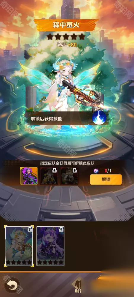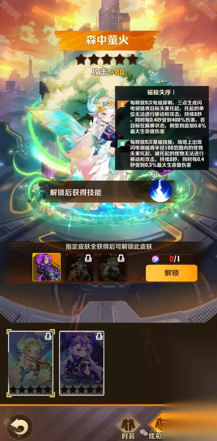 「森中萤火」 时装品质:炫彩 时装效果(主动):每释放5次电磁穿刺,三点生成闪电锁链将目标失重托起,托起的单位无法进行移动和攻击,持续2秒,同时每0.4秒受到400/480/560/640/720%伤害,若目标在麻痹状态,则受到追加0.6/0.7/0.8/0.9/1%最大生命值伤害 时装效果(被动): 获取方式:获取指定前置时装后,消耗超感纤维解锁
