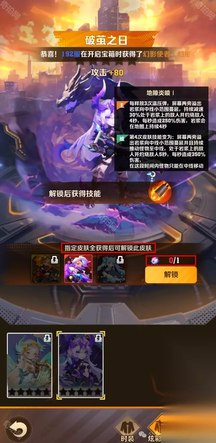 二、全新炫彩品质时装皮肤介绍 「破茧之日」 时装品质:炫彩 时装效果(主动):每释放3次温压弹,屏幕两旁溢出岩浆向中线小范围蔓延,持续减速30%处于岩浆上的敌人并灼烧敌人4秒,每秒造成250/300/350/400/450%伤害,岩浆会在地图上持续4秒 时装效果(被动): 获取方式:获取指定前置时装后,消耗超感纤维解锁