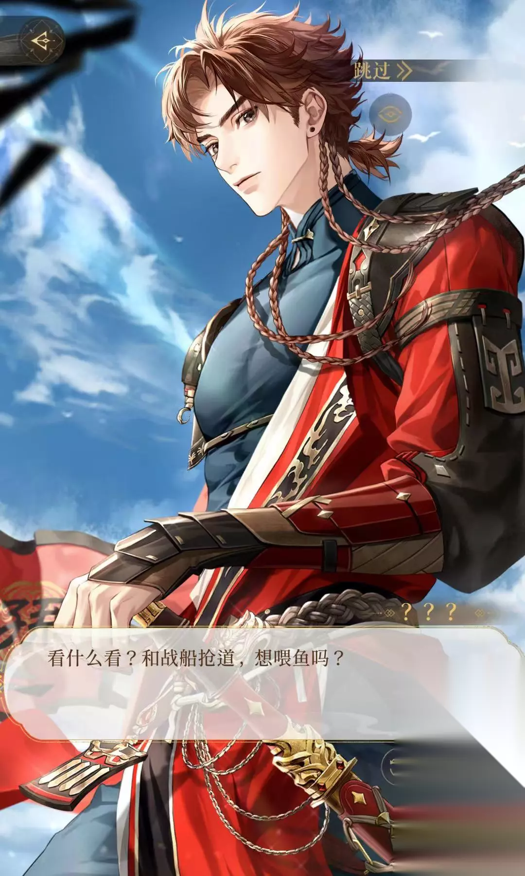 行水路途中,玩家出外还能巧遇孙策战船路过,触发相识剧情。这里玩家有两个选项可选,“移开眼神”与“盯着他看”,两个选项可重复看剧情选,不同选择会有稍微不同的语音剧情。