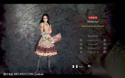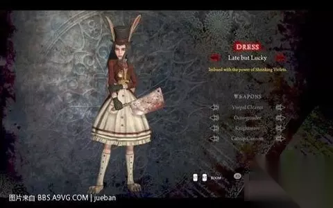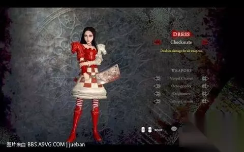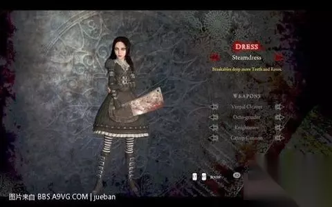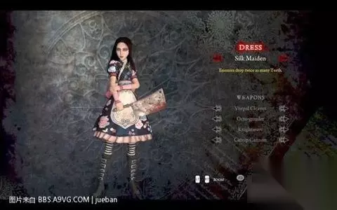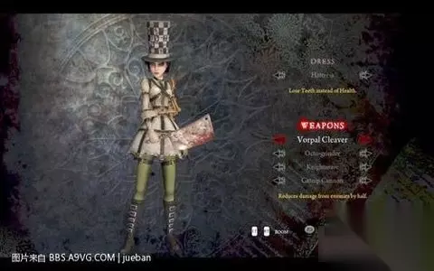 这个是短发版alice,看惯了长发,这个也不错嘿嘿 另外DLC里的4件武器分别对应4件原始武器,只不过加了特效,在这里把特效也说一下 vorpal cleaver 对应vorpal blade 特效为所有伤害减半