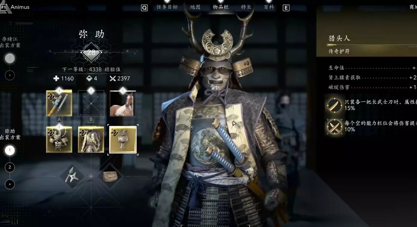 先将自己的等级提升到20级,再去考虑装备的问题,不然打起其他的小怪会非常费力。咱们主要是收集四件装备,武器、头盔、胸甲以及饰品。要想收集弥助的装备,人物一定得选奈绪江,因为有一些山洞使用弥助进不去,而且还不能爬墙。第一个需要收集的武器叫做丹心,在神仓神社的位置。打开地图先传送到神仓神社的瞭望台,从上面跳下来之后顺着山路往左边走。一直看见右边有一颗大树盘绕到前面的路上,顺着这个大树上去然后朝着山上去爬。翻过面前的小山坡就能看见一个箱子,这个箱子里面就有弥助的毕业武器。接着就可以去收集武士大名头盔了,位置在播磨的左边,可以先传送到稻荷山瞭望塔。落地以后先往左边走,跑到七种瀑布的位置。