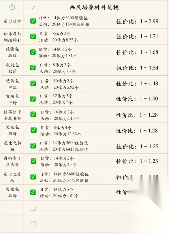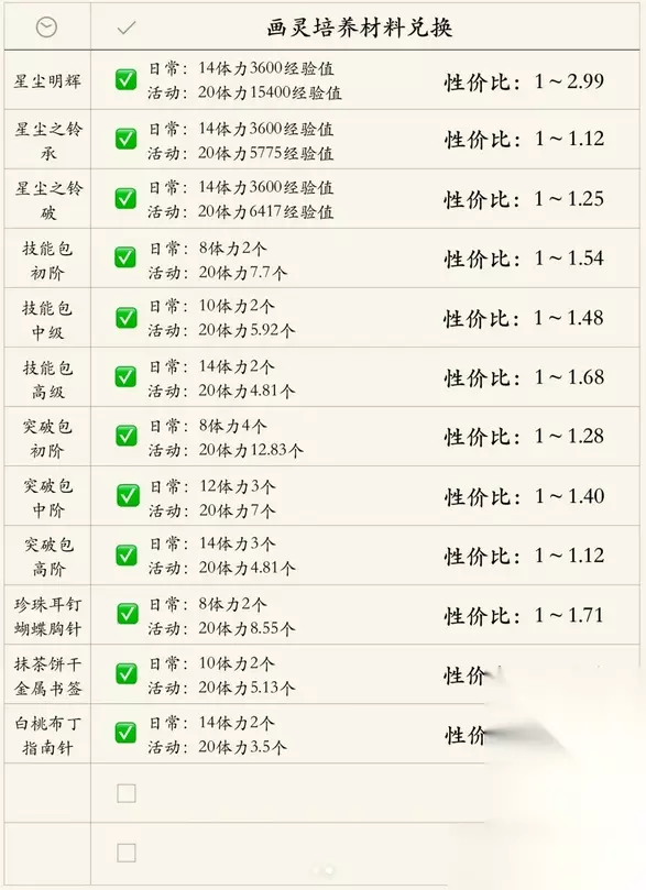 1.日常所计算的培养材料均为最大化获得量,活动所计算的培养材料均为最高难度时无画灵加成时最大获得量,即该图计算出性价比会相对较低【实际性价比更高】; 2.性价比越高,越值得兑换。即本次活动最值得兑换的为星尘明辉,但要注意的是,该培养材料只能用于SSR以下画灵(不包括SSR)。 3.司岚生日卡牌测评: 三围较高,血量要有18000+就完美了。 CD=5,2T冻条非常强力。 日常:减防+增伤+对冻条增伤 高难:冻条 通用:群充+特技买3送1 群充增伤SSR-司岚Ver,附带冻条、减防,泛用性很高。 组司队或无群充SSR则推荐度极高,其他环境因其高泛用性也推荐抽取。