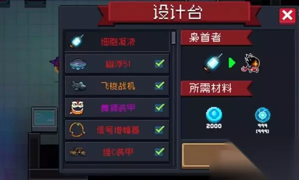 4、打开设计台,可以看到研发枭首者要999个细胞和2000蓝币。