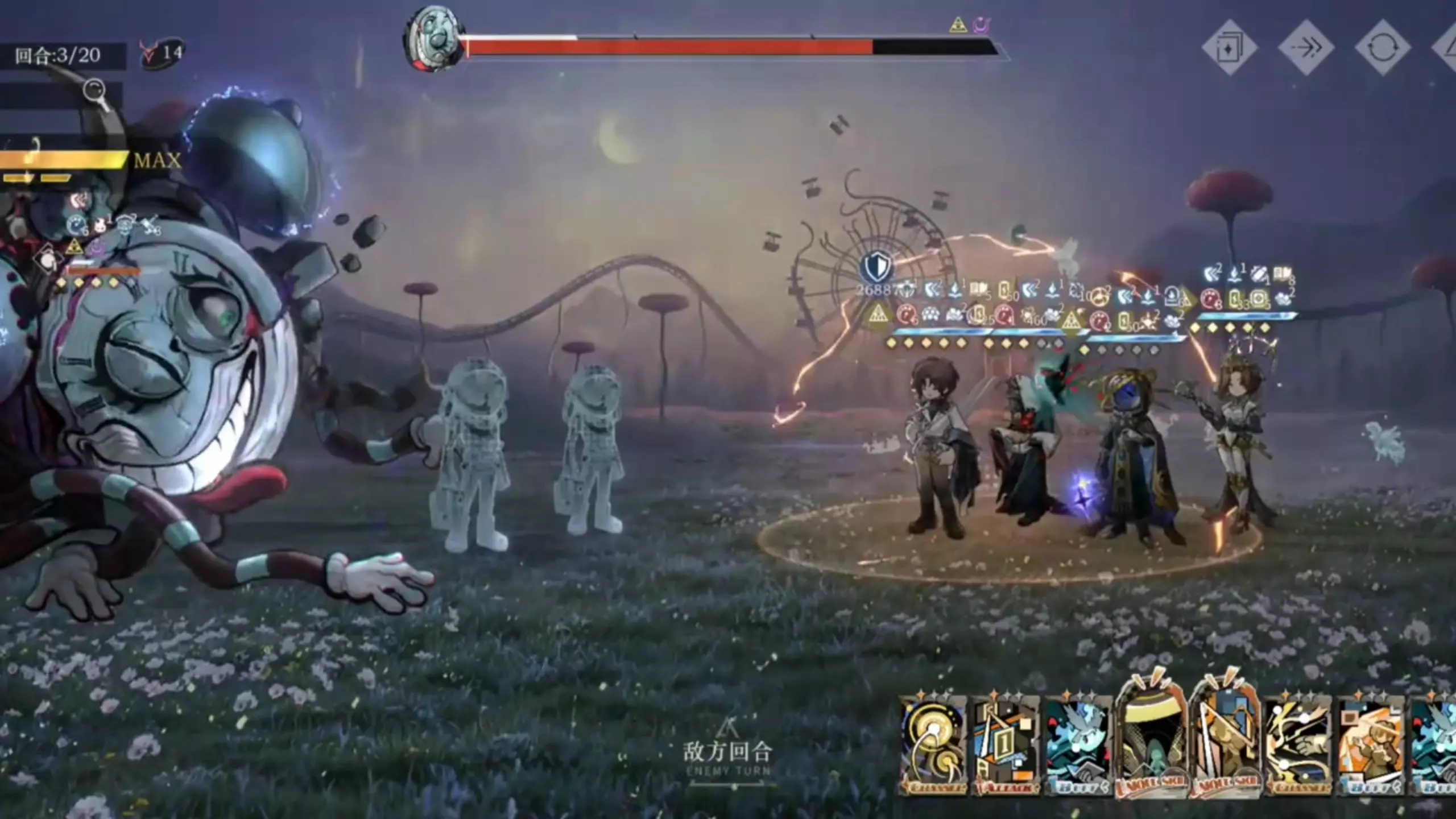 这是游戏《重返未来:1999》的战斗内容,展示了新余辉队全满塑60级角色的战斗表现,该队伍仅用5回合就打出4000万伤害,伤害数值十分惊人。