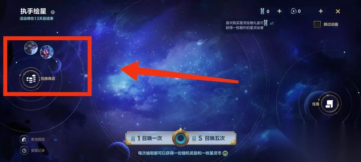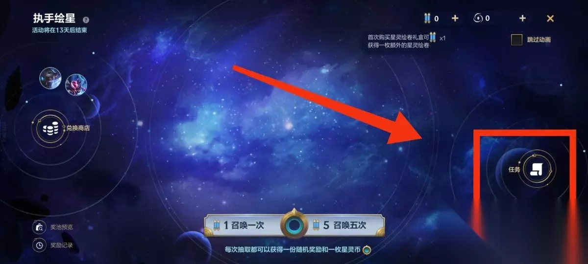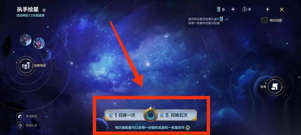 5.玩家完成任务后获得星灵绘卷即可参与召唤任务,每次抽取可获得随机奖励以及一枚星灵币,如下图所示: