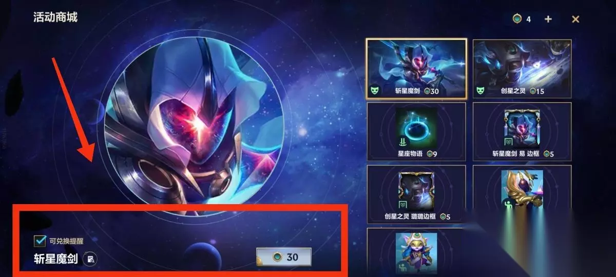 7.进入活动商城后,选择斩星魔剑,可以看到30枚星灵币才可以兑换。所以想要拥有这款皮肤的玩家可以积极参与该活动。如下图所示: