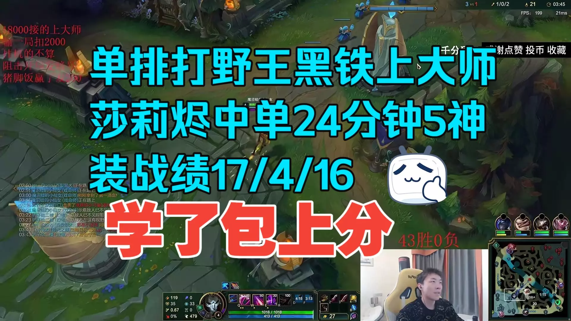 这是LOL主播莎莉的直播回放,展示了他用小鱼人打野的黑铁上大师单排攻略局,该局21分钟就出了5神装,打出12/0/5的完美战绩,目前该账号41胜0负,学这套打法有望帮助玩家上分。