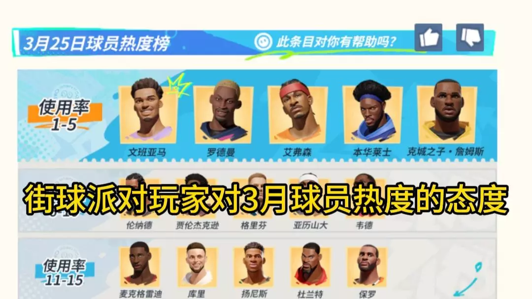 这是一篇篮球游戏的球员热度榜锐评帖,展示了3月25日的球员使用率榜单,对榜单中文班亚马、格里芬、库里等球员的排名提出看法,认为部分高人气球星排名靠后是低段位玩家撑起,还质疑榜单包含11分赛数据。