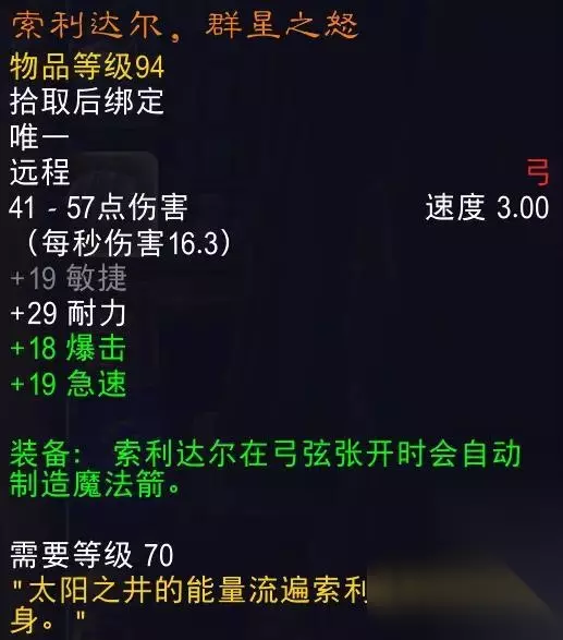 魔兽世界中有很多造型独特的弓箭,有的历史悠久,有的则独一无二。今天,我们就来盘点一下哪些弓箭化身深情! 1 索里达,星辰之怒猎人的橙色弓由太阳之井的最终Boss 基尔加丹掉落。当年这件武器就是魔法箭,不需要买材料就可以占包。这件武器足够风神了,正因为如此,这么多年了,每周仍然会有猎人去太阳之井队伍把基尔加丹塞回厕所里!而这把武器在炉石传说中也非常受欢迎,是大美女温蕾萨卡牌的衍生武器!