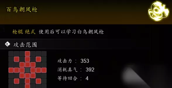 特殊效果 使目标集气值-20%。 5级效果-白鸟朝凤:使用后自身暴击抵抗+20%,为自身添加1~2层招架效果,期间招架率提升20%,持续3回合。招架:有20%几率每层使自身被攻击时减免35点伤害,持续3回合。 10级效果-有凤来仪: 使用本招式后,自身周围8格目标额外受到-100点伤害,自身气血+150。 这就是逸剑风云决百鸟朝凤枪获取攻略的全部内容了,总的来说确实是一个比较难的问题本,希望看了这篇攻略的每个玩家都了解。