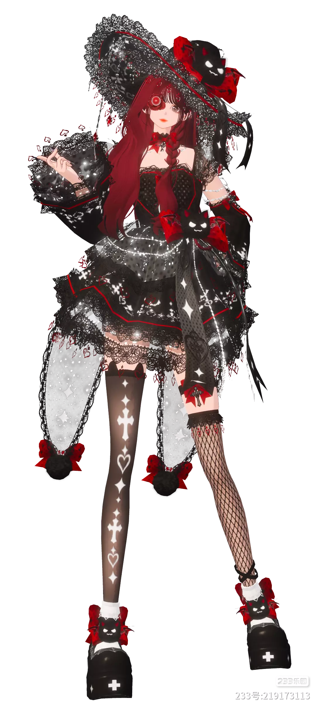 融合哥特风格与洛丽塔元素的暗黑甜酷风,以黑红为主色调搭配银色闪片、蕾丝等材质,既保留哥特的暗黑感,又通过红色蝴蝶结、爱心图案增加甜美元素。服饰:波点、十字架印花等叠加闪片、透明纱裙营造华丽感;配饰:带恶魔角的黑猫装饰(帽子、腰带、鞋子)、单眼红色齿轮装饰,强化氛围。