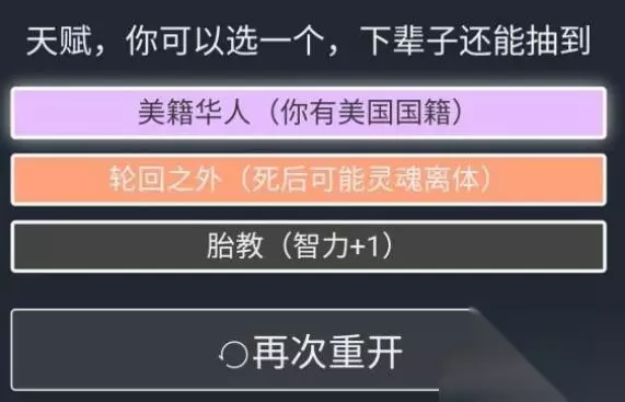 人生重开模拟器轮回之外有什么用?轮回之外是一个橙色天赋,具体怎么用接下来就看看小编给大家整理的人生重开模拟器轮回之外作用详解吧! 轮回之外有什么用? 橙色天赋轮回之外,死的早有几率离体