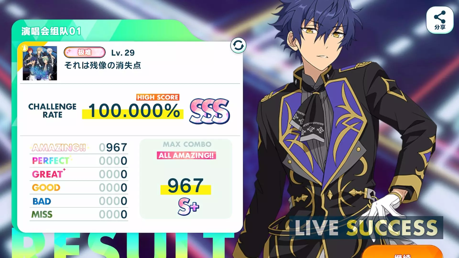 这是《偶像梦幻祭2》的游戏手元视频,展示了歌曲《それは残像の消失点》Special 29难度的游玩过程,以9.0流速、-1.1偏移的设置完成,操作中达成多次高连击,呈现了精彩的音游操作。