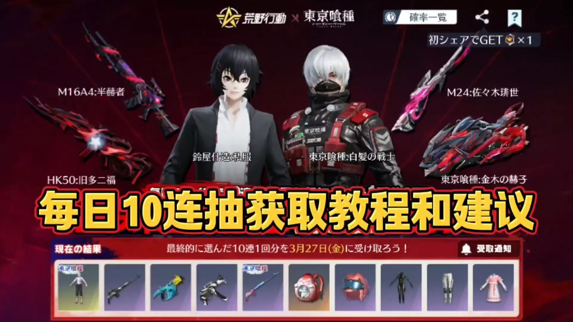《荒野行动》开启与《东京喰种》的联动活动,有每日登录抽10连、邀请好友领金木研常服等福利,还有壁虎讨伐战任务可拿积分,能抽取联动枪械皮肤、伙伴等限定奖励。