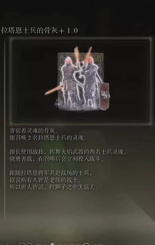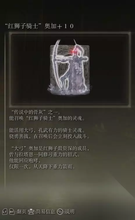 36、37拉塔恩士兵的骨灰+【传说】红狮子骑士奥加(消耗专注106) 获取方式: 从打完碎星的赐福一路向前走可以到达英灵地下墓地 在墓地里探索捡取+战胜BOSS后获得两个骨灰。