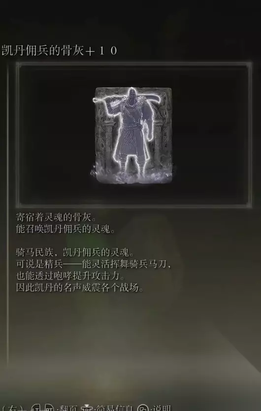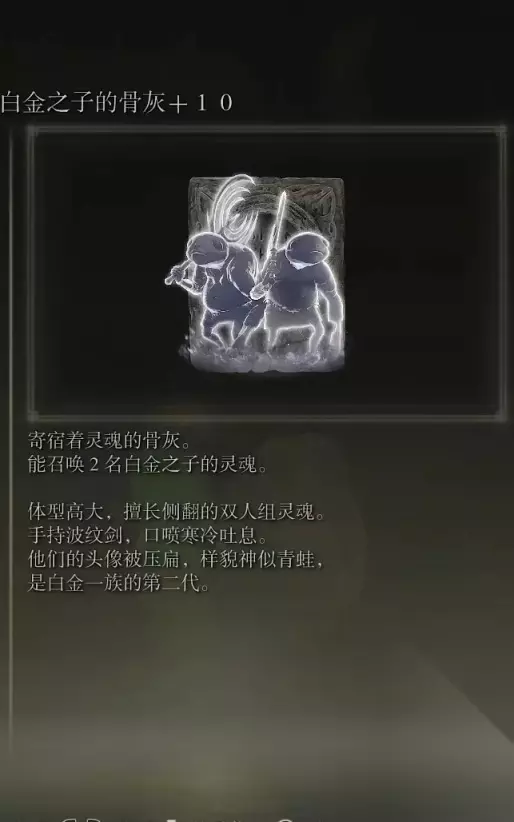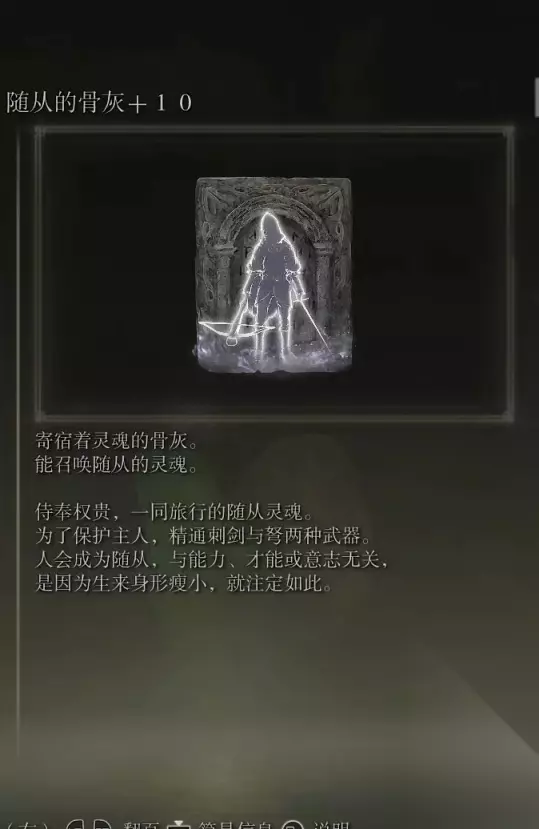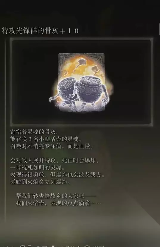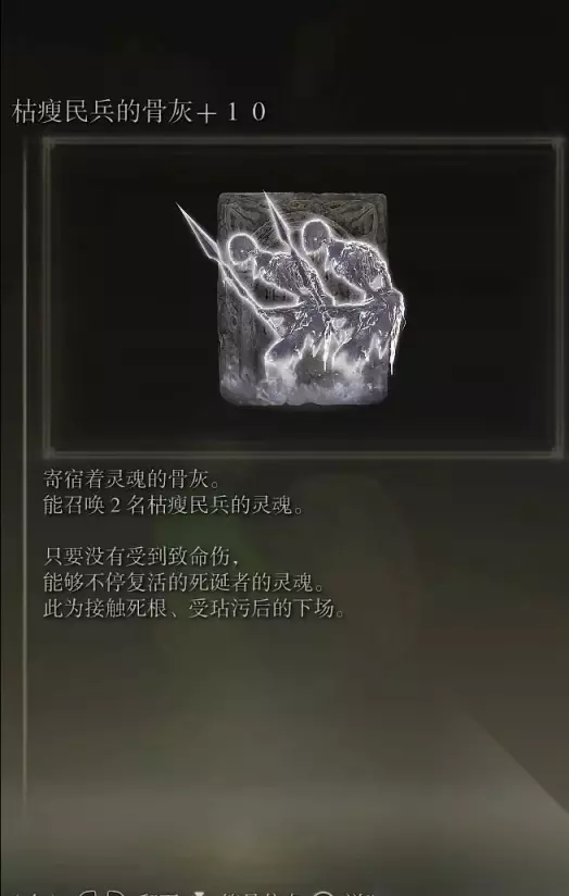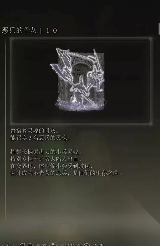 48、恶兵的骨灰(消耗专注70) 获取方式: 亚雷萨英雄墓地内探索到跳下横梁处,在一堆咒蛙附近可以捡取到该骨灰