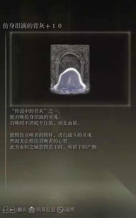 14、【传说大哥】仿身泪滴(消耗血量660) 获取方式:从祖灵森林赐福身后出发,在拿狩猎指头刀的路上房间二楼有一个用石剑钥匙才能开启的门,开启后可获得