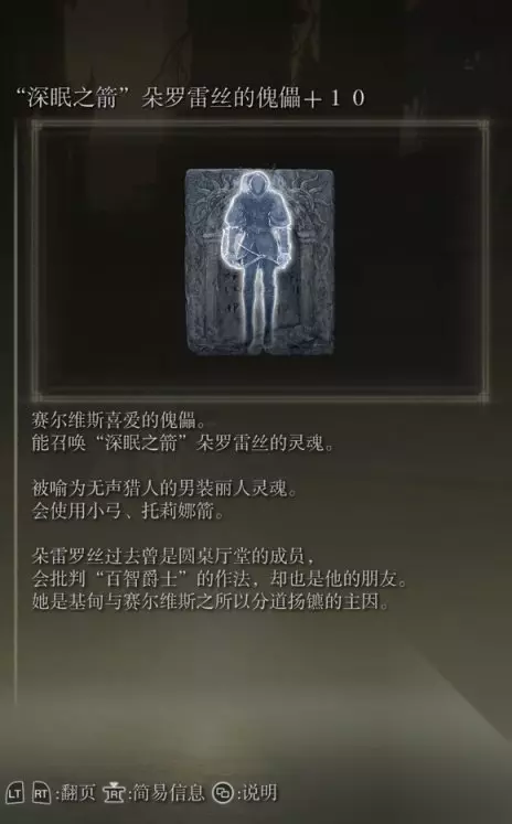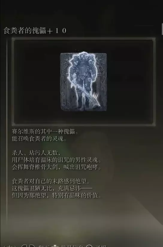 需要注意的是每个周目只能选择一个NPC,并会导致对应NPC的支线中断。 之后推进魔女菈妮的支线,在塞尔维斯死后(玩家拿到了狩猎指头刀并到达了安瑟尔河上游这段剧情时候) 在塞尔维斯魔法塔附近可以跳到卡利亚城寨的一个房间,在房间里可以捡取到对应喂的NPC的骨灰,如果没有喂获得的是深眠之箭朵罗雷丝的傀儡