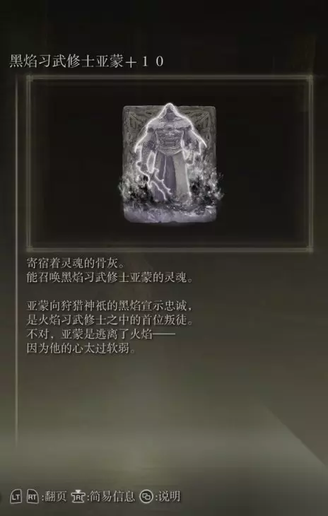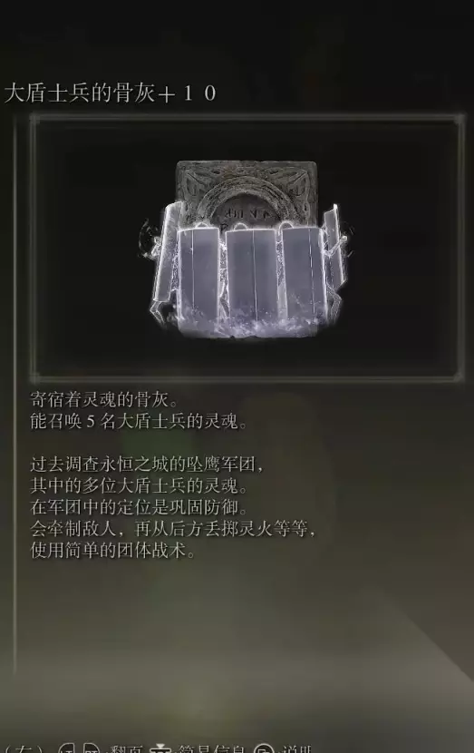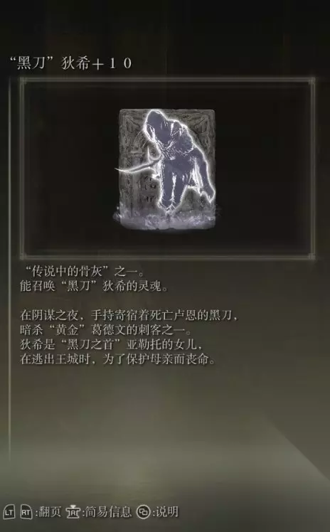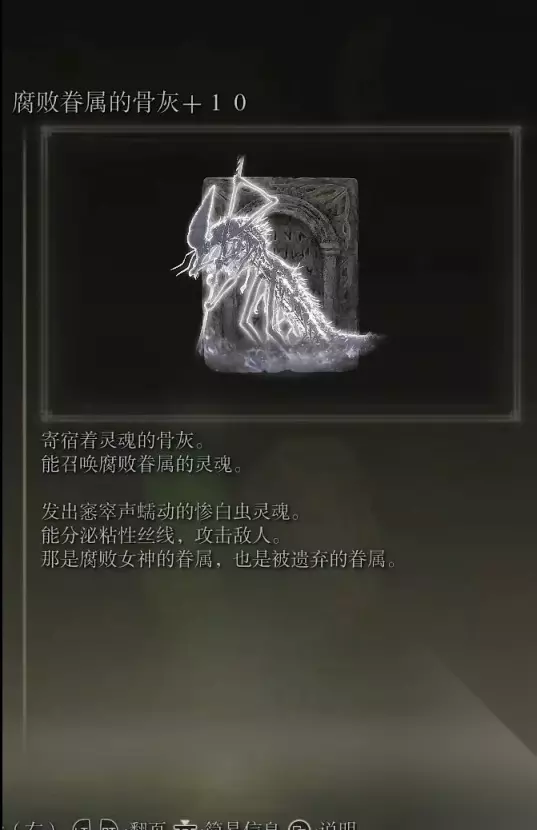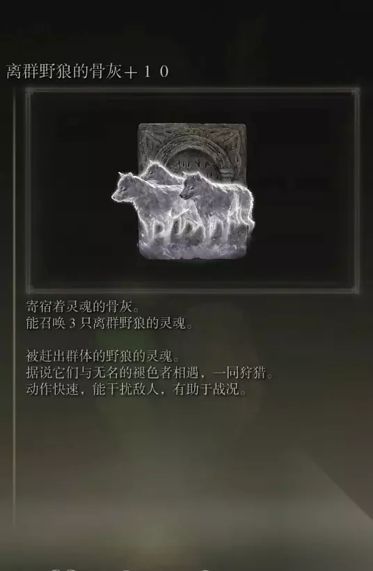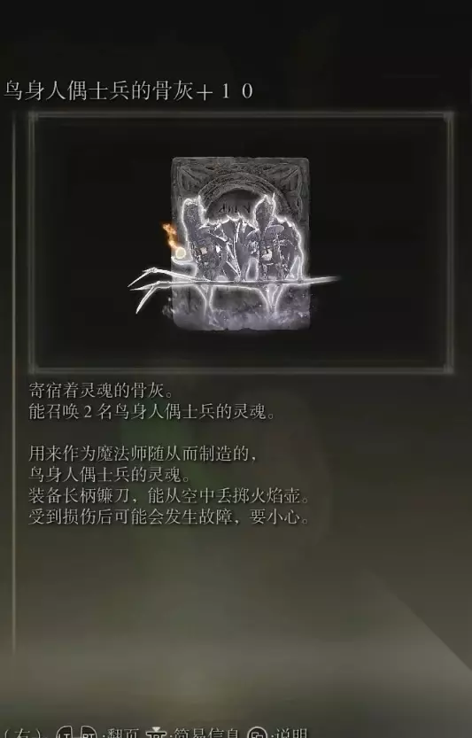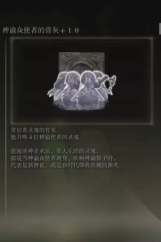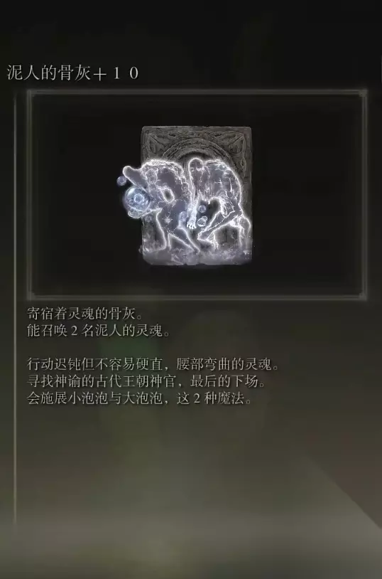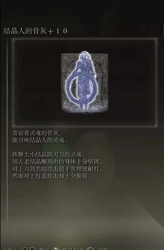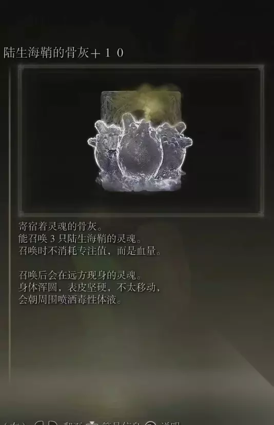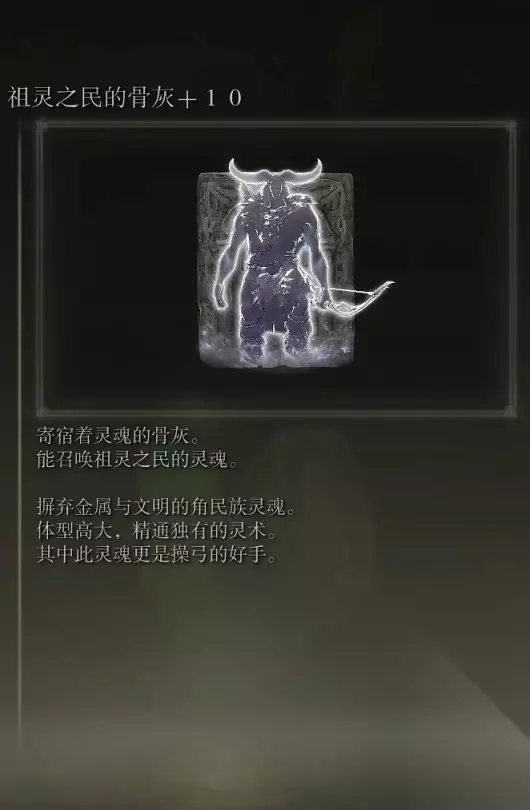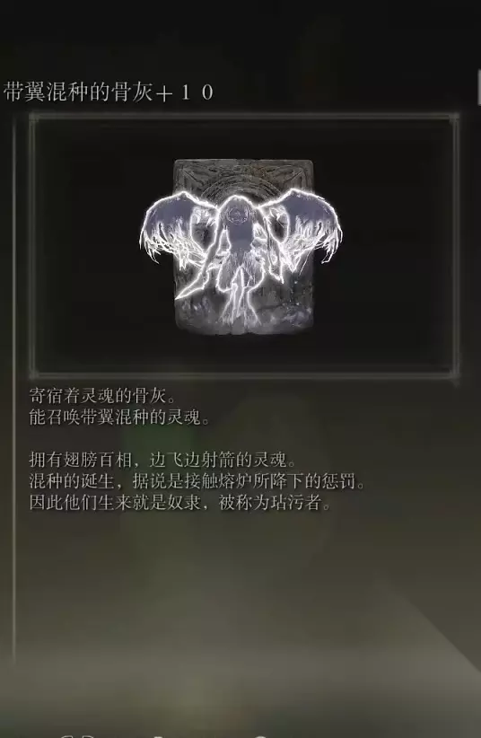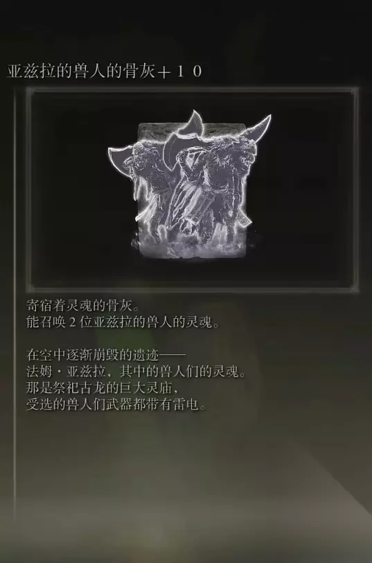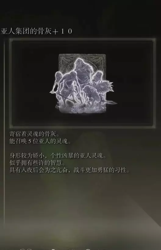 10、亚人集团的骨灰(消耗专注69) 获取方式: 啜泣半岛东北部的穿刺地下墓地打败BOSS后获得