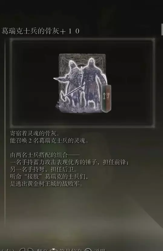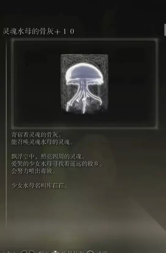 7、葛瑞克士兵的骨灰(消耗专注54) 获取方式: 从风暴山丘的破屋赐福出发,在图中一堆水母附近可以捡取到该骨灰。