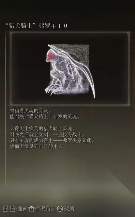44、猎犬骑士弗罗(消耗专注95) 获取方式: 格密尔英雄墓地打败BOSS后获得