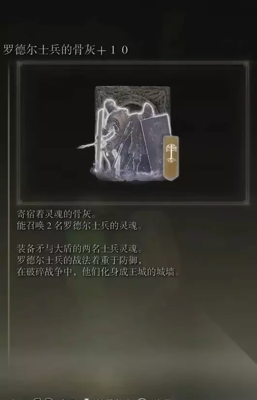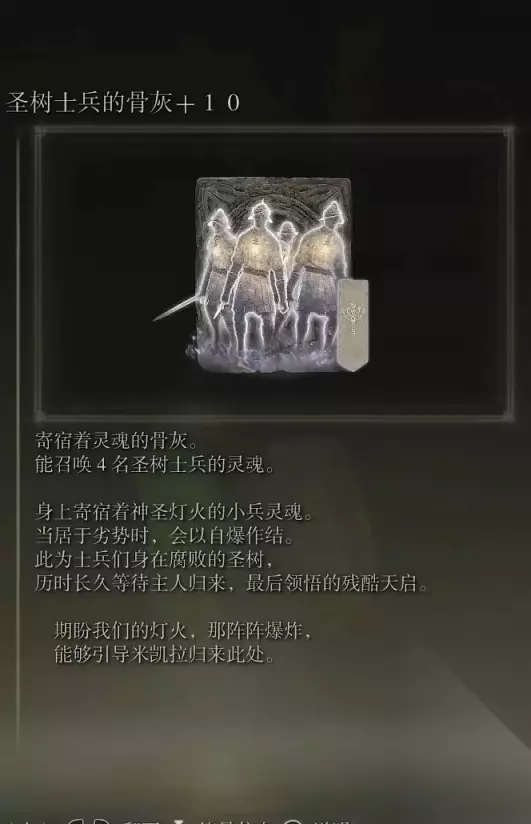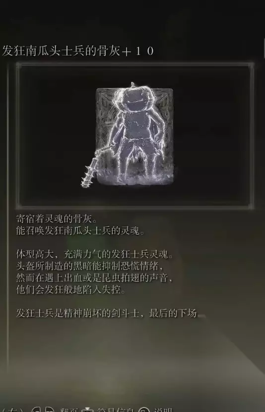 32、发狂南瓜头士兵的骨灰(消耗专注110) 获取方式:在盖利德西北部的黄金树附近的小黄金树地下墓地内打败BOSS后获得