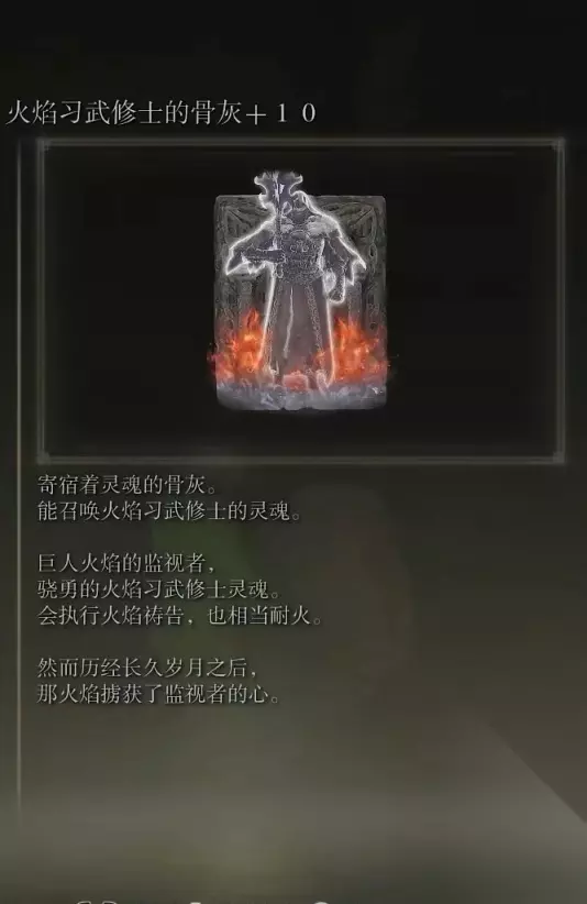 52、火焰习武修士的骨灰(消耗专注85) 获取方式: 巨人山顶地下墓地内,在乘坐第一个电梯下去后,把这个电梯踩上去,可以看到还有一个隐藏电梯,乘坐隐藏电梯下去探索可以在宝箱内获得该骨灰。