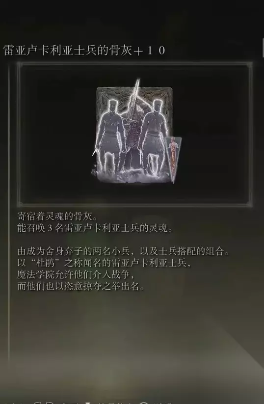 21、22雷亚卢卡利亚士兵的骨灰(消耗专注59)+辉石魔法师的骨灰(消耗专注49) 获取方式: 利耶尼亚西侧的绝路地下墓地探索开启宝箱+打败BOSS后获得