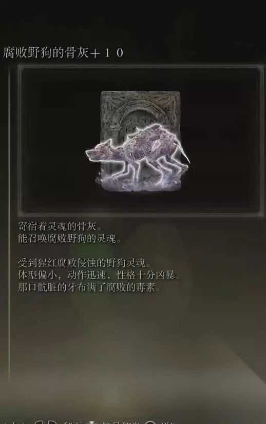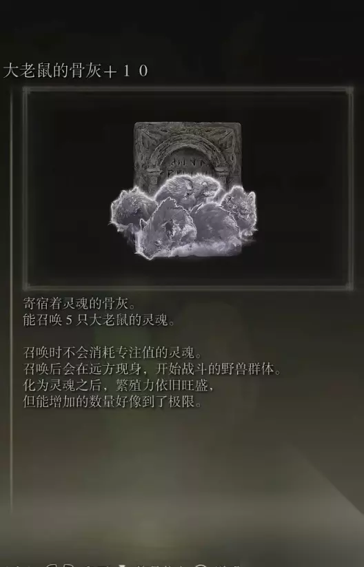 41、大老鼠的骨灰(无消耗) 该骨灰会根据强化等级增加召唤数量,最多可召唤5只。 获取方式: 亚坛高原北部的西边风车牧场的木屋内捡取(里面会有几只小老鼠+一只大号老鼠)