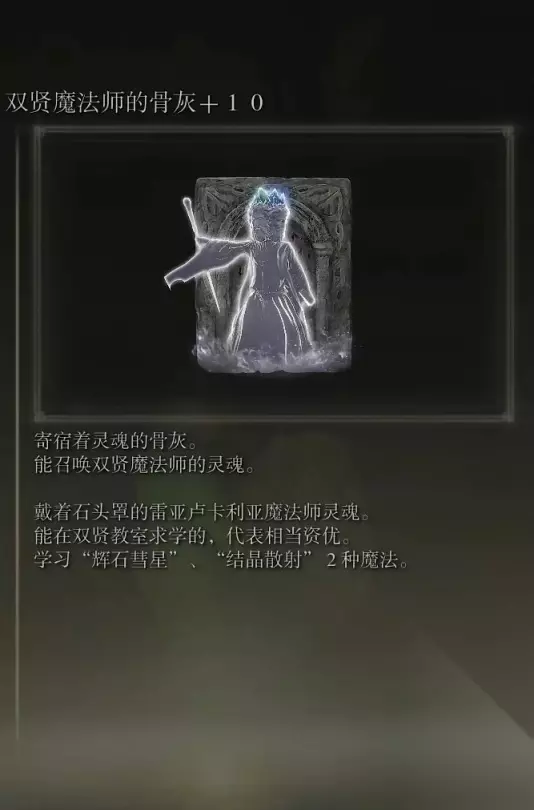23、双贤魔法师的骨灰(消耗专注89) 获取方式: 利耶尼亚东北部的黑刀地下墓地打败BOSS后获得