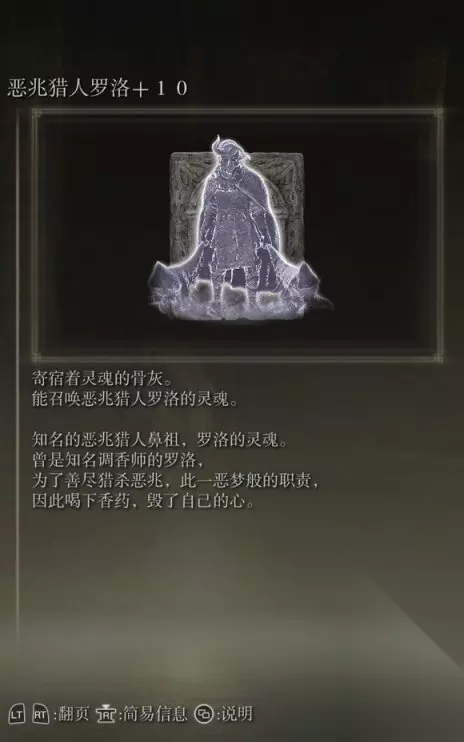 50、恶兆猎人罗洛(消耗专注113) 获取方式: 从禁域赐福出发坐回王城的电梯,前往东亚神授塔。 在路上会有两个恶兆之子BOSS,打败后获得该骨灰。