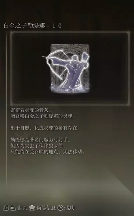 59、白金之子勒缇娜(消耗专注74) 获取方式:利耶尼亚结晶洞窟底部战胜boss后与npc对话,去往白金村获得护符后返回再次对话获得