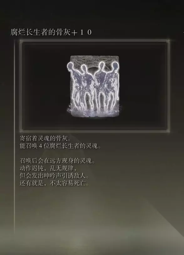 30、腐烂长生者的骨灰(消耗专注40) 获取方式: 牢狱洞窟内打败BOSS后获得 (BOSS身后还可以捡到一把武器欧赫宝剑)