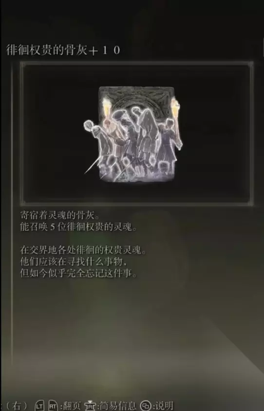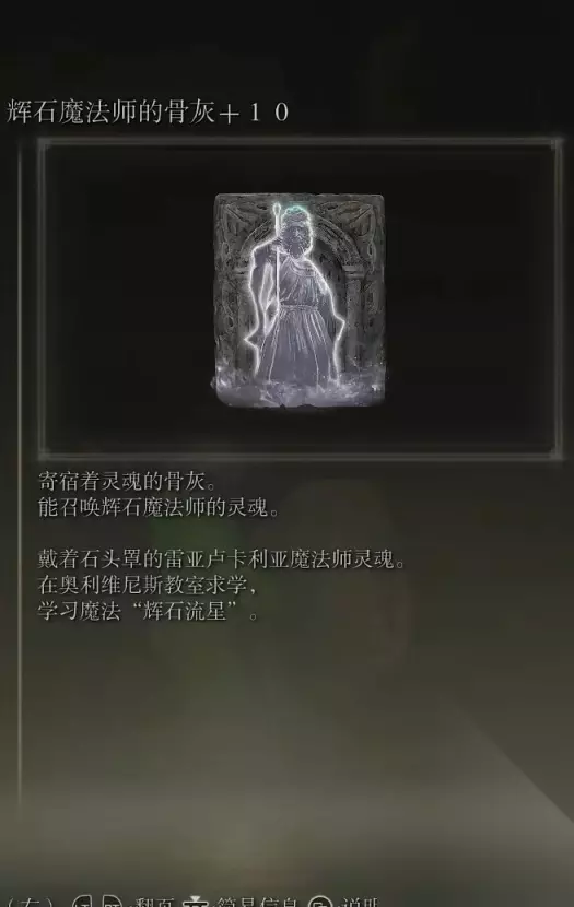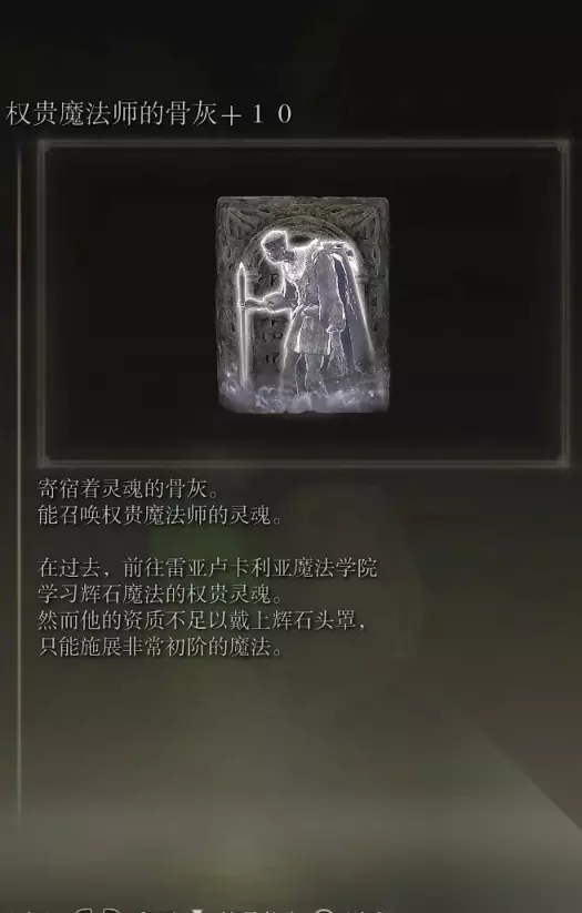 3、徘徊权贵的骨灰(消耗专注28)+4、权贵魔法师的骨灰(消耗专注11) 获取方式: 宁姆格福引导之始赐福的西北方风暴根脚的地下墓地内探索捡取+打败BOSS后获得