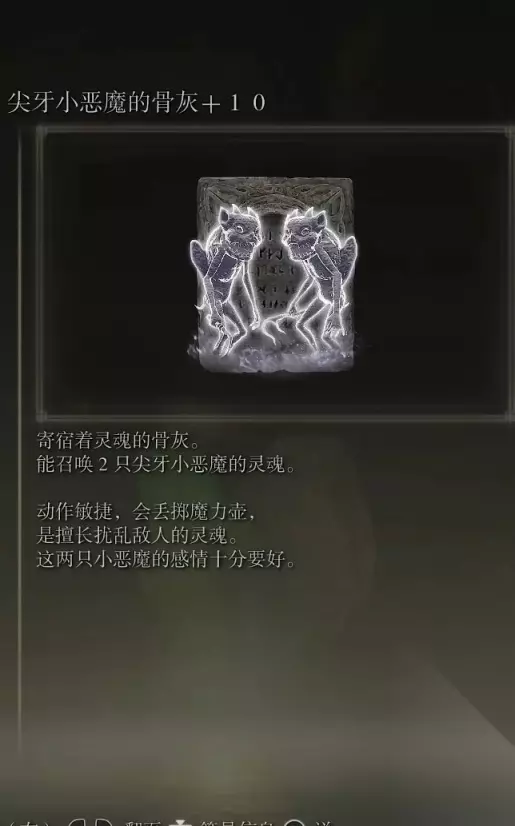 16、尖牙小恶魔的骨灰(消耗专注50) 获取方式 获取方式1:出生时自带物品可选择 获取方式2:在魔法学院的学院正门口赐福,不要和封印互动而是直接穿过一直前进,会有一个流浪商人,在他这里购买该骨灰。