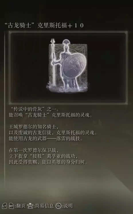 42、43罗德尔士兵的骨灰(消耗专注64)+【传说】古龙骑士克里斯托福(消耗专注108) 获取方式: 尊贵者的英雄墓地内探索捡取+打败BOSS后获得