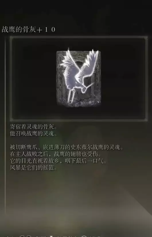 5、战鹰的骨灰(消耗专注52) 获取方式: 首先玩家需要在史东薇尔城在红圈的房间内找到《绘画》预言 然后前往啜泣半岛的巡礼教堂,在教堂北部悬崖处会有画家的灵魂,触发后可以捡取到该骨灰。
