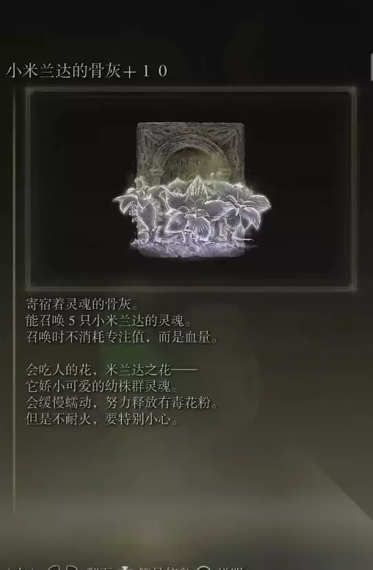 34、35小米兰达的骨灰(消耗专注血量185)+腐败眷属的骨灰(消耗专注73) 获取方式: 盖利德南部的盖利德地下墓地内探索捡取+BOSS战获胜后获得 这里特别说明下,小米兰达的骨灰需要玩家在下楼梯后往里走的右侧有一个隐藏门后捡取 BOSS房门正后方也是一个隐藏墙壁,里面是BOSS房的拉杆。